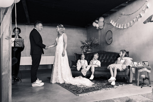 Eerst het klaarmaken en vervolgens na de first look de foto's maken. De ceremonie was erg mooi, klein en ingetogen, waarbij niemand het droog kon houden toen de kids ook ieder hun zegje mochten doen. Ik krijg nog steeds kippenvel en een brok in mijn keel als ik de foto's weer zie van dat moment.
